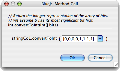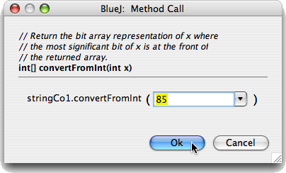 After you do this, a dialog box will be displayed in which you can type the parameters to the method you want to test. For example, to test the convertFromInt method on the value 85 you would type the value in the dialog box and then press "OK" as shown below: