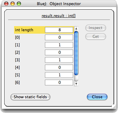 This dialog box doesn't actually provide much useful information because the result of the convertFromInt is an array. If, however, you double-click on the box containing the array, then BlueJ will pop up a window like the one shown below displaying the contents of the array.